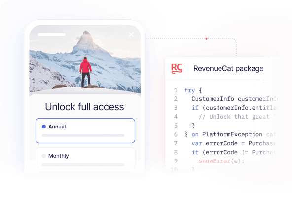 With RevenueCat, the implementation and maintenance of purchases across mobile, Smart TV and web are simplified. Go to market quicker and spend less time supporting platform updates.
